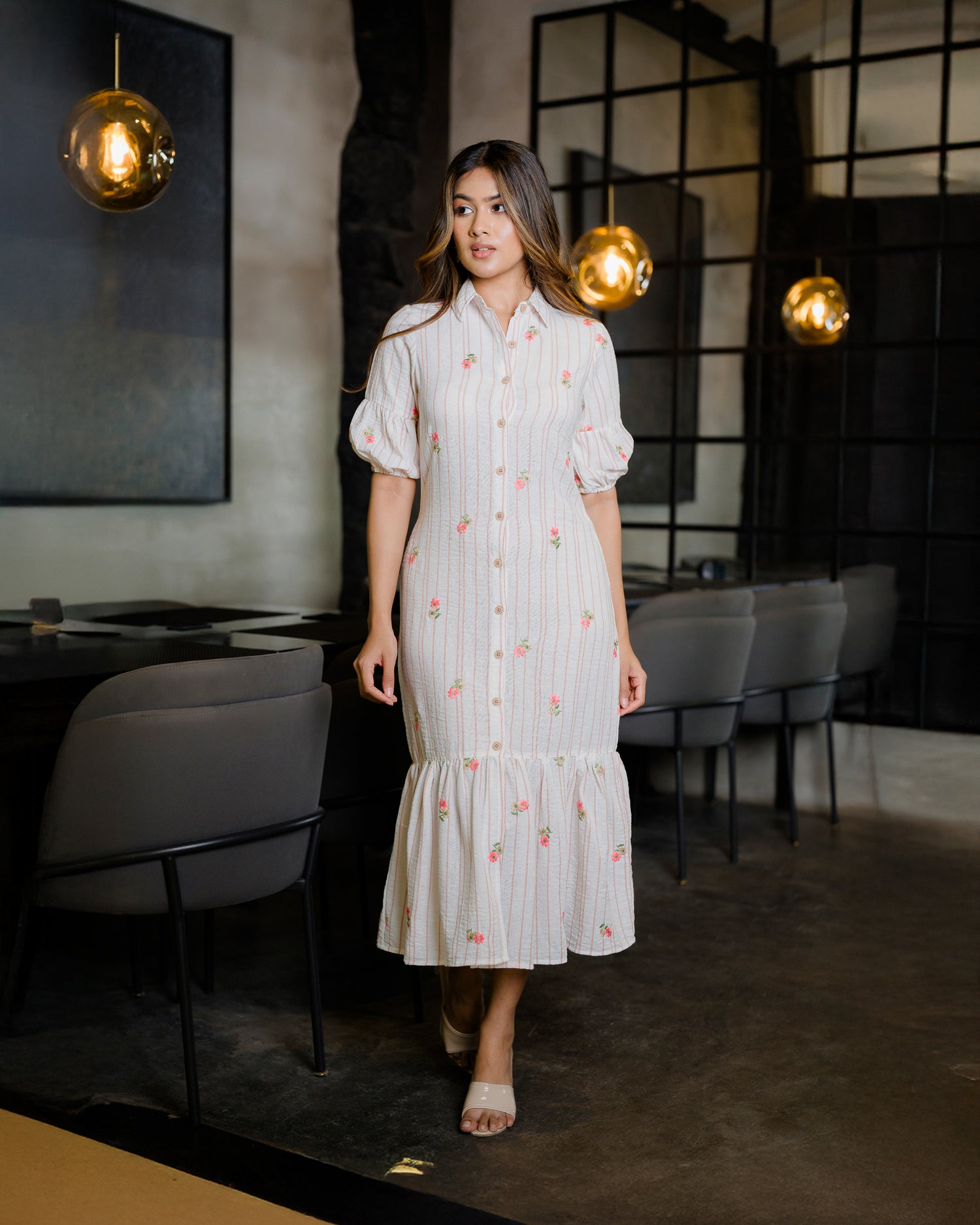 Button Down Linen Embroidered Detail Dress
