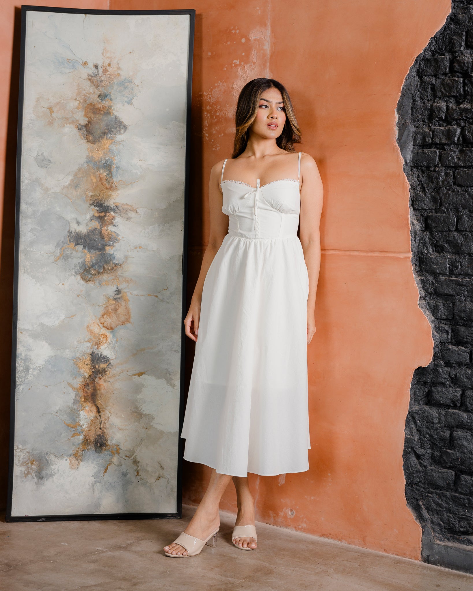 Make an elegant statement with this corset-style criss cross dress in pristine white. The fitted corset bodice delivers sculpted support and a refined silhouette, while the interlocking criss cross straps add contemporary flair and dimension. Ideal for weddings, formal occasions, or upscale daytime events where understated sophistication matters. The crisp white palette projects purity and grace, offering endless styling possibilities with metallic accessories, delicate jewelry, or neutral footwear. A versatile investment piece that combines structured tailoring with modern design sensibility.