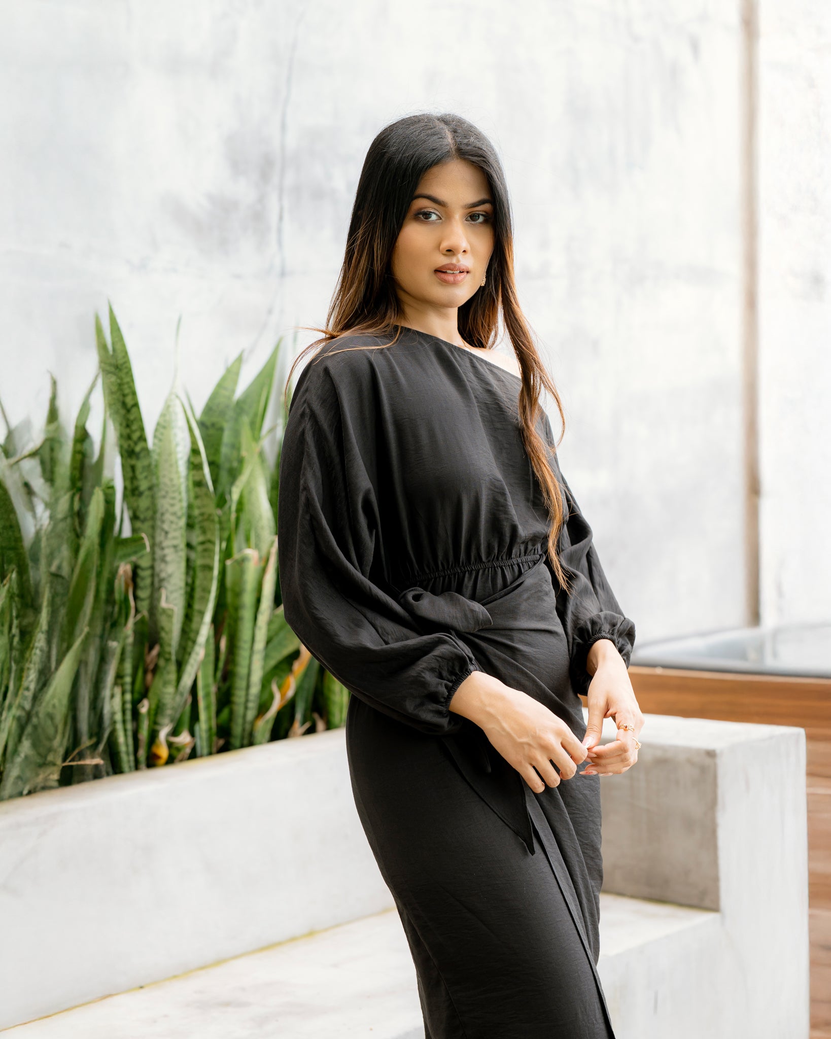 Effortlessly chic, this drop shoulder long sleeve dress combines contemporary silhouette with functional design. The front knot detail adds visual interest and allows for customizable fit, while the relaxed drop shoulder creates a modern, comfortable aesthetic. Crafted in classic black, this versatile piece transitions seamlessly from casual daywear to evening occasions. The long sleeves provide coverage and elegance, making it an essential addition to any wardrobe seeking understated sophistication.