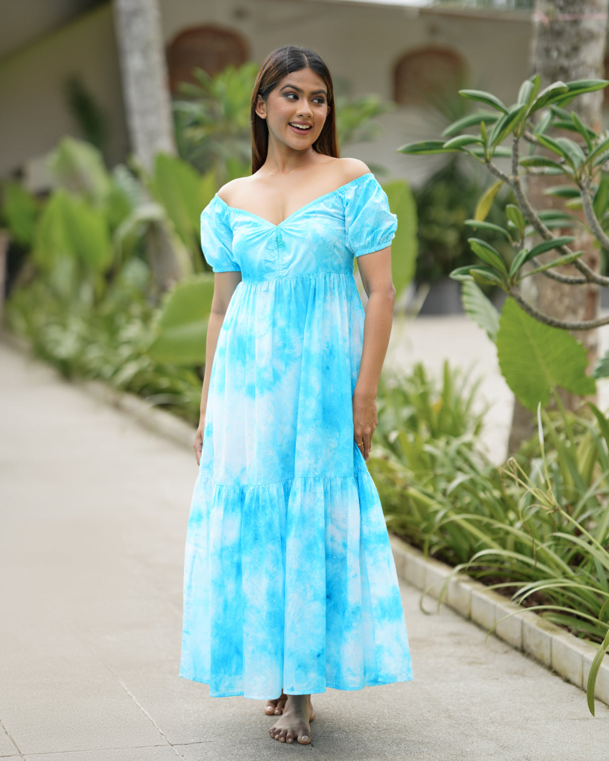 Neck Gathered Tie-Dye Maxi Dress