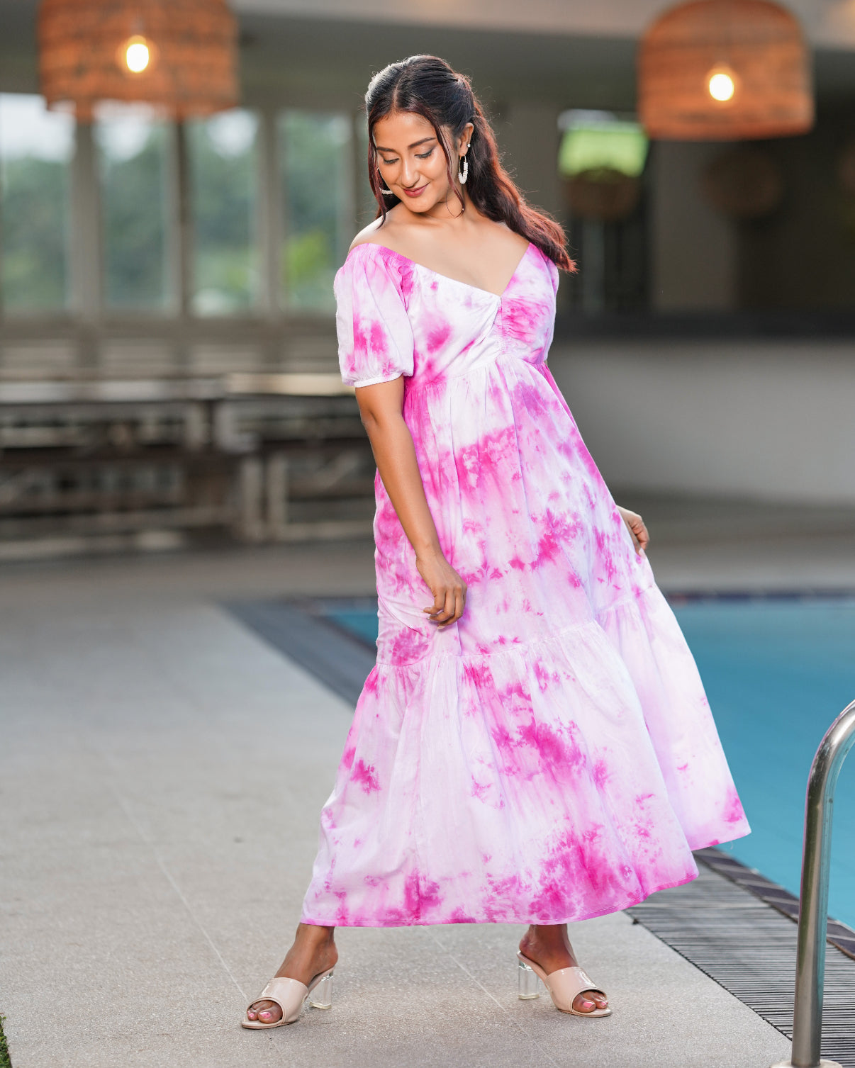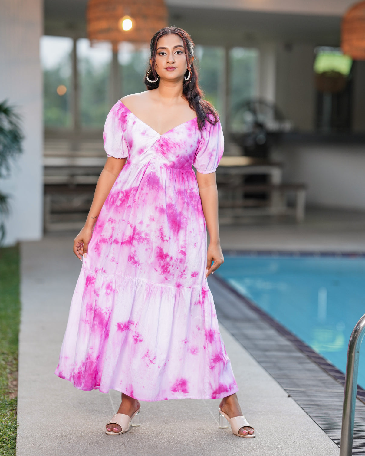 Look chic and effortlessly stylish in our Neck Gathered Tie-Dye Maxi Dress. The gathered neckline adds a touch of elegance while the tie-dye design gives a trendy and unique look. Crafted with comfortable and lightweight fabric, this dress is perfect for any occasion.
