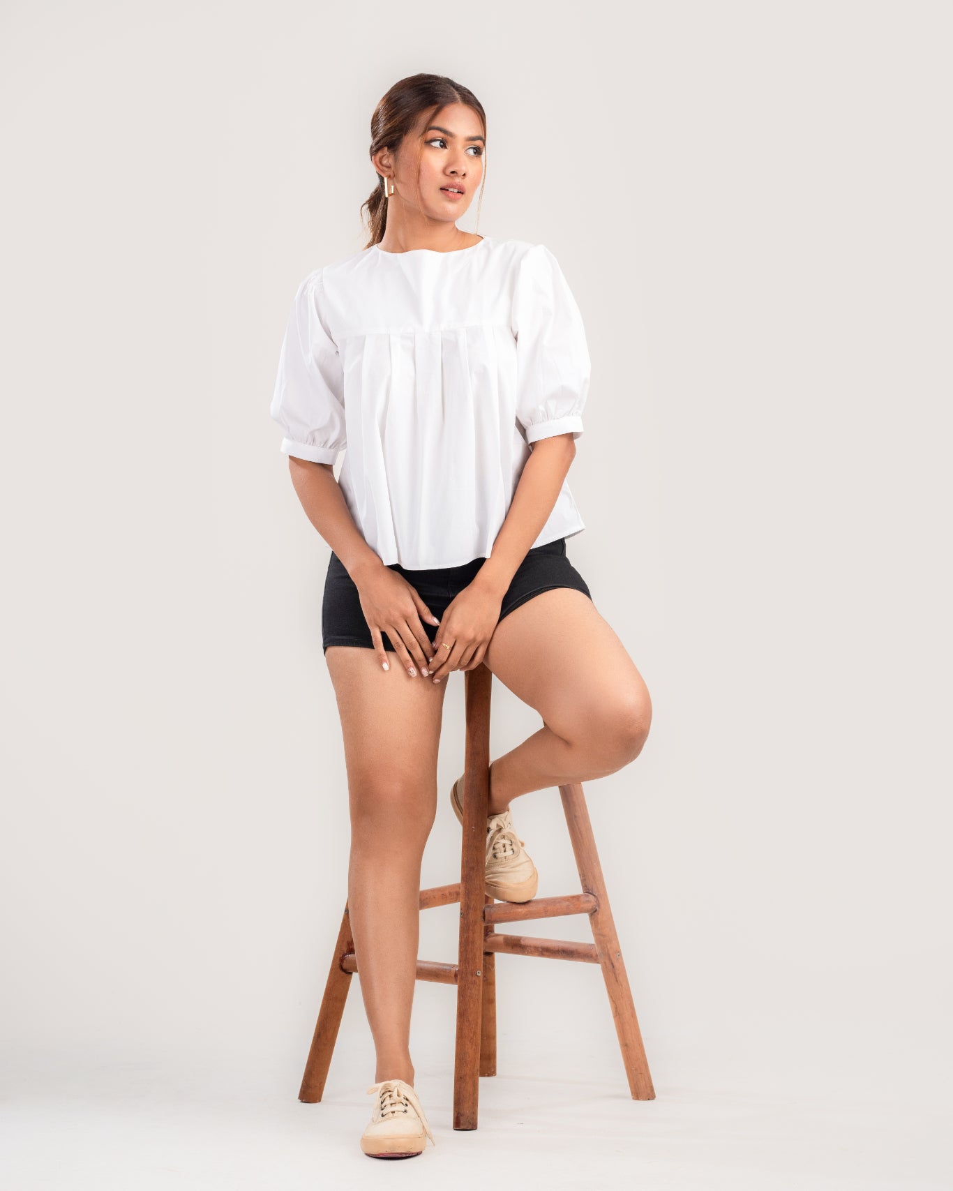 Embrace sophistication with our elegantly styled Pleated Blouse featuring delicate puffed sleeves, perfect for adding a touch of timeless charm to your wardrobe.
