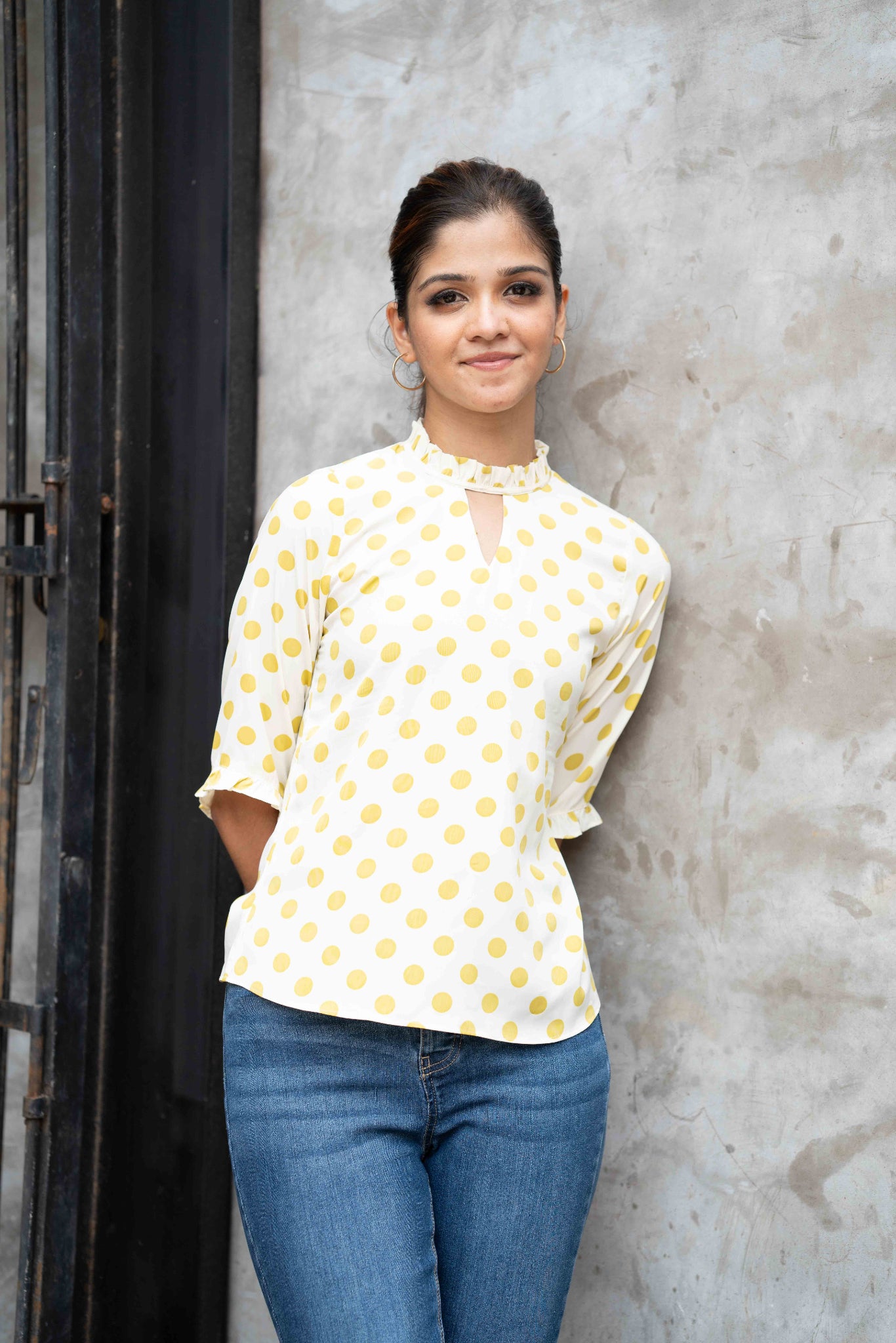 This Polka Dot Frill Detail Blouse is the perfect addition to your wardrobe. The polka dot pattern adds a playful touch while the frill detail creates a feminine silhouette. Made with high-quality fabric, it offers comfort and style for any occasion. Expertly designed for the modern woman.