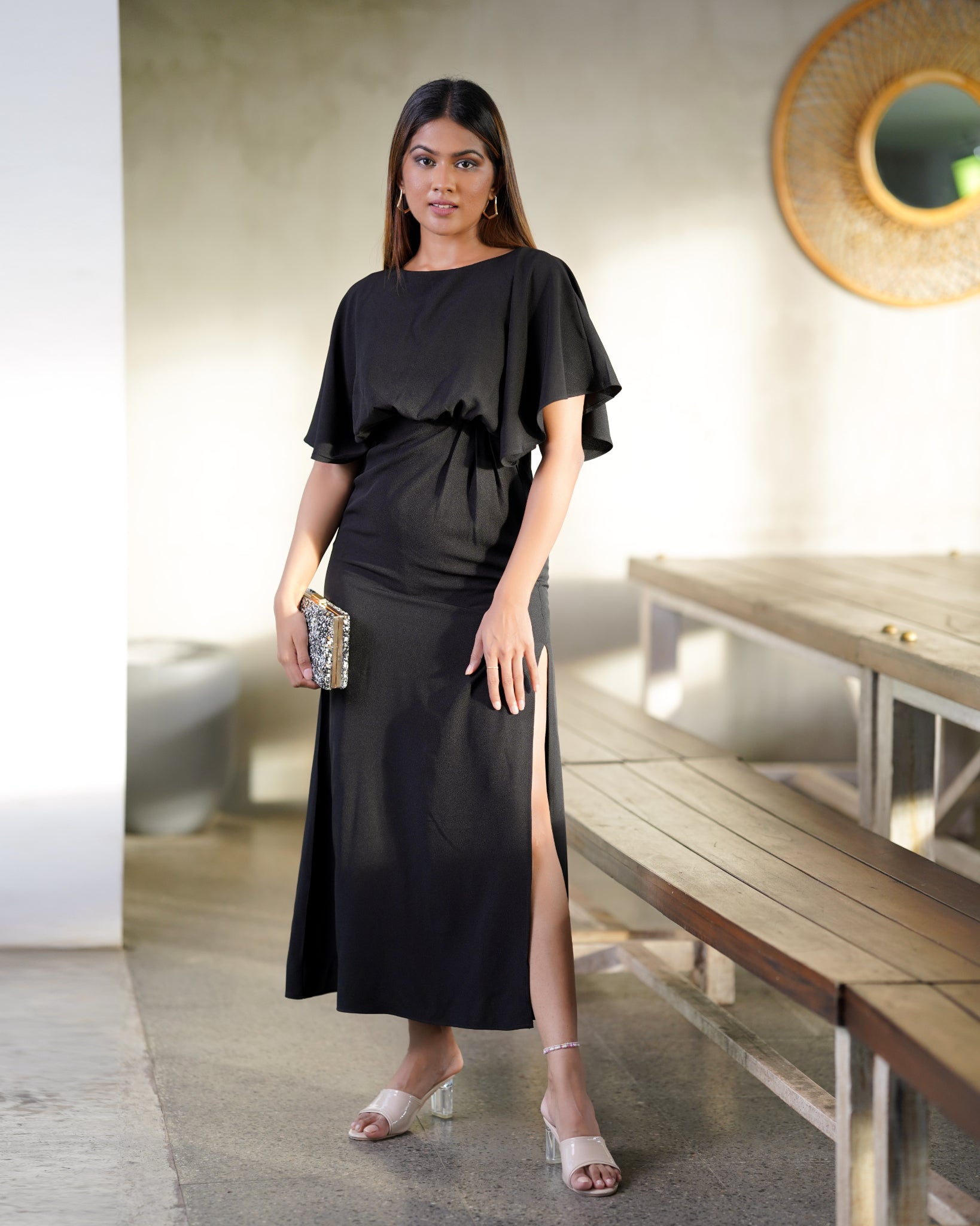 This elegant Evening Dress features a ruffle split front slit for a touch of glamour and sophistication. Made from high-quality fabric, it offers both comfort and style for any formal occasion. The versatile design allows for easy accessorizing, making it a must-have for any fashion-forward wardrobe.