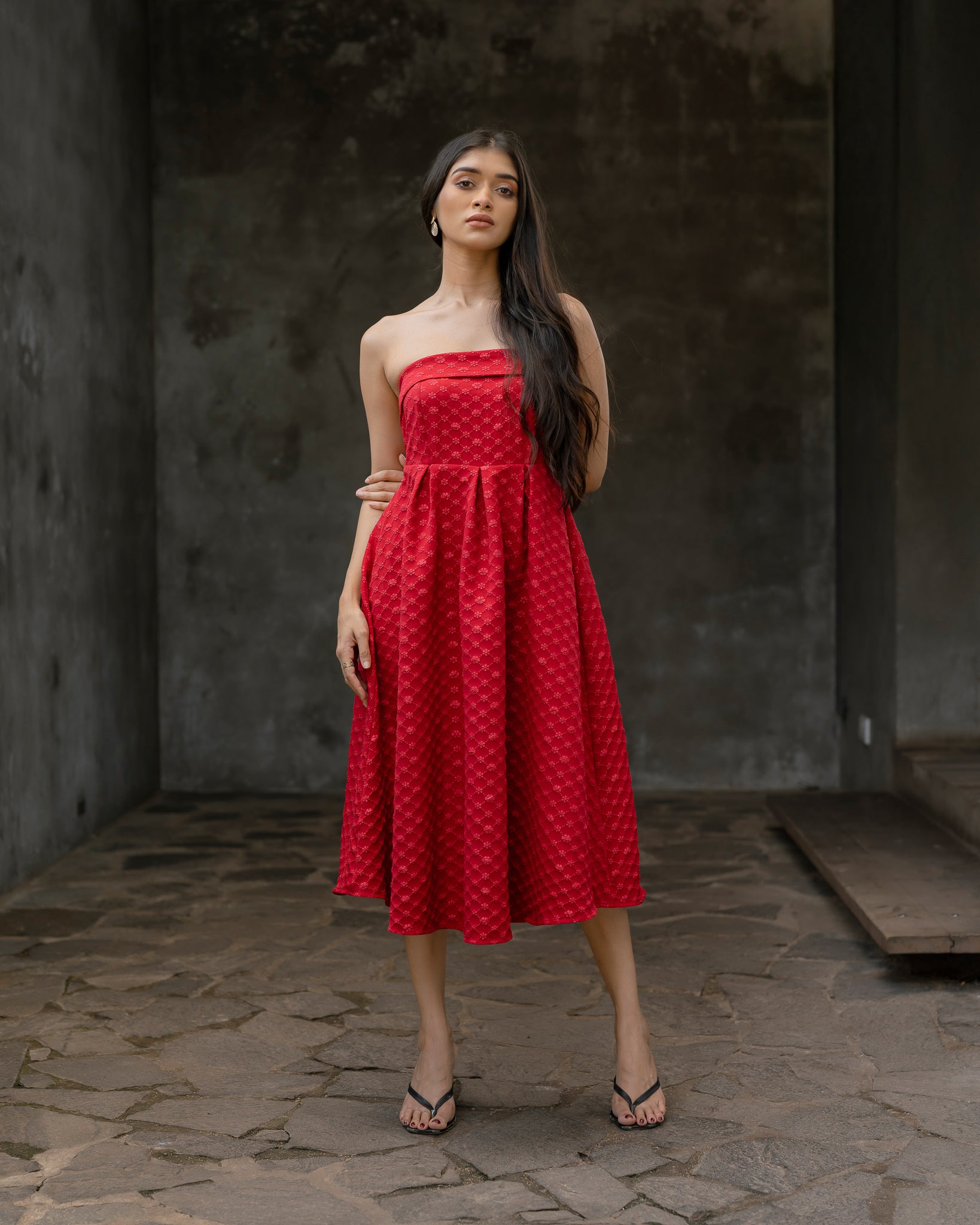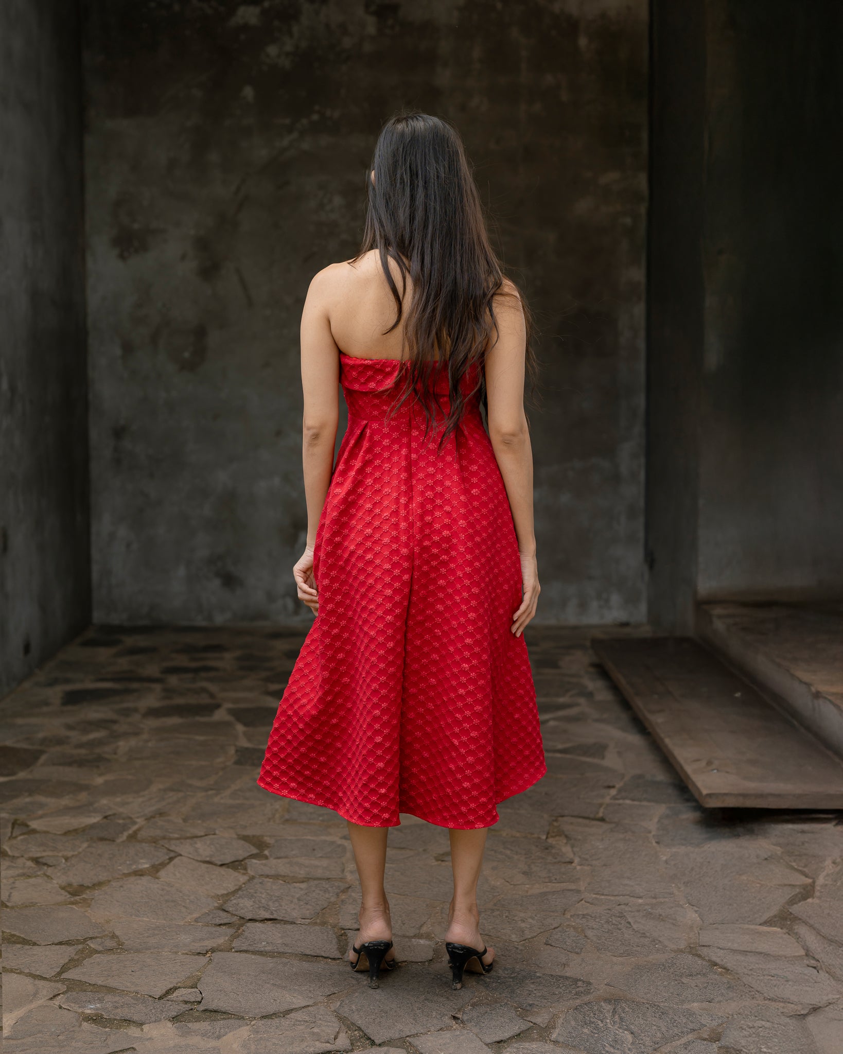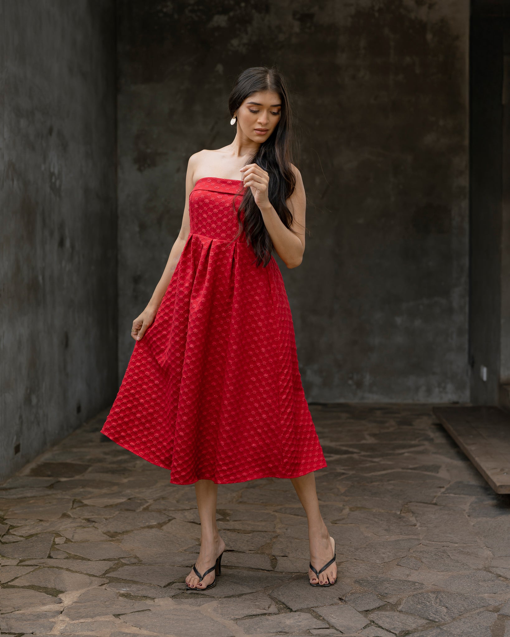 Elevate your wardrobe with this sophisticated strapless midi dress in striking red. Designed with a sleek, minimalist silhouette, this piece transitions seamlessly from daytime elegance to evening occasions. The strapless neckline creates a refined, modern aesthetic while the midi length offers versatile styling options. Perfect for cocktail events, dinner dates, or upscale casual outings, this dress pairs effortlessly with heels, strappy sandals, or statement jewelry. The structured design ensures a flattering fit that works for various body types, making it an essential addition to any sophisticated wardrobe.