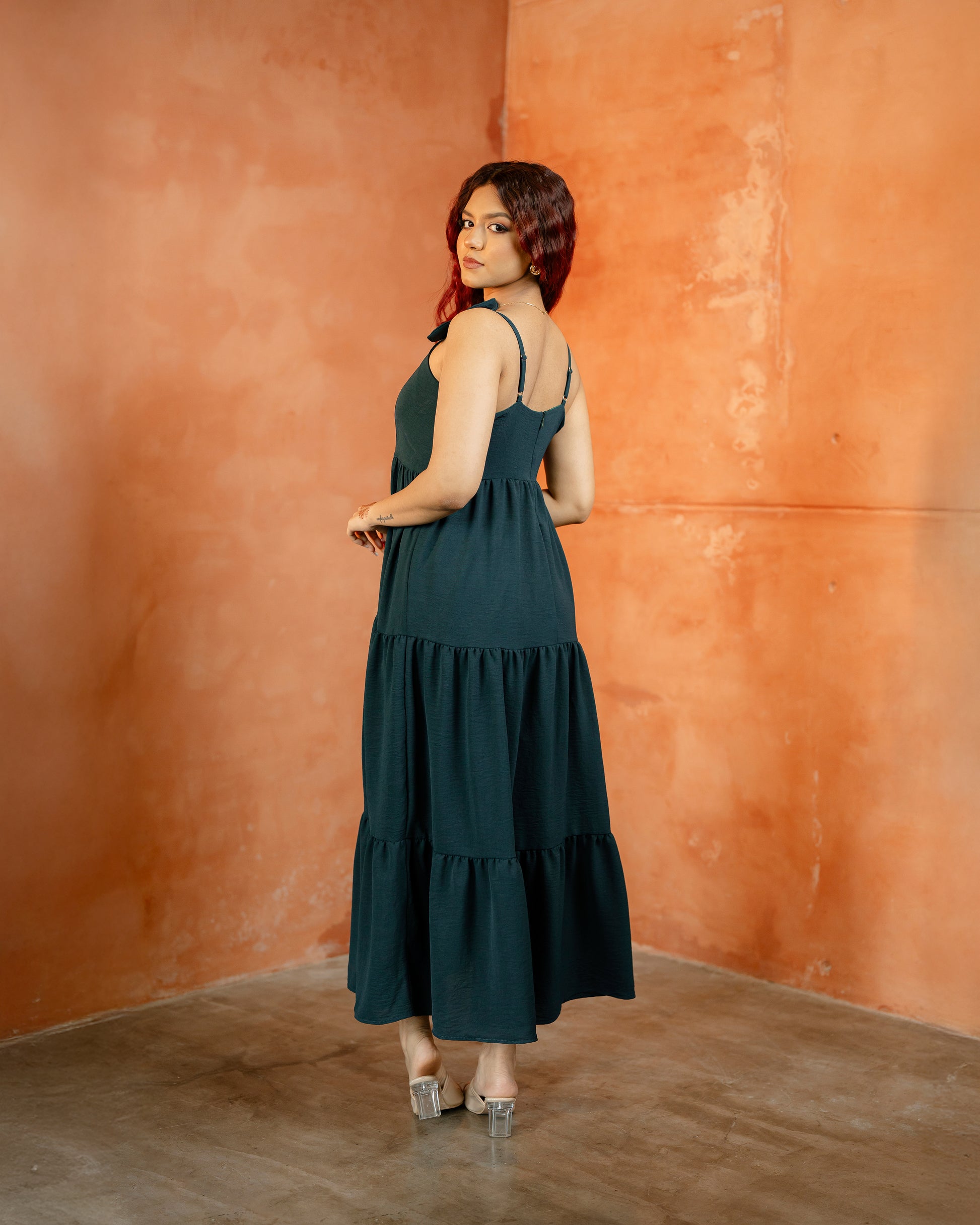Elevate your wardrobe with the Strappy Flower Detail Dress in a rich dark green hue. This expertly crafted dress features delicate straps and intricate floral accents, offering a refined balance of elegance and subtle charm. Ideal for both formal occasions and stylish everyday wear, its flattering silhouette enhances your natural shape while the dark green color adds a sophisticated touch. Perfect for those seeking a timeless yet distinctive piece.