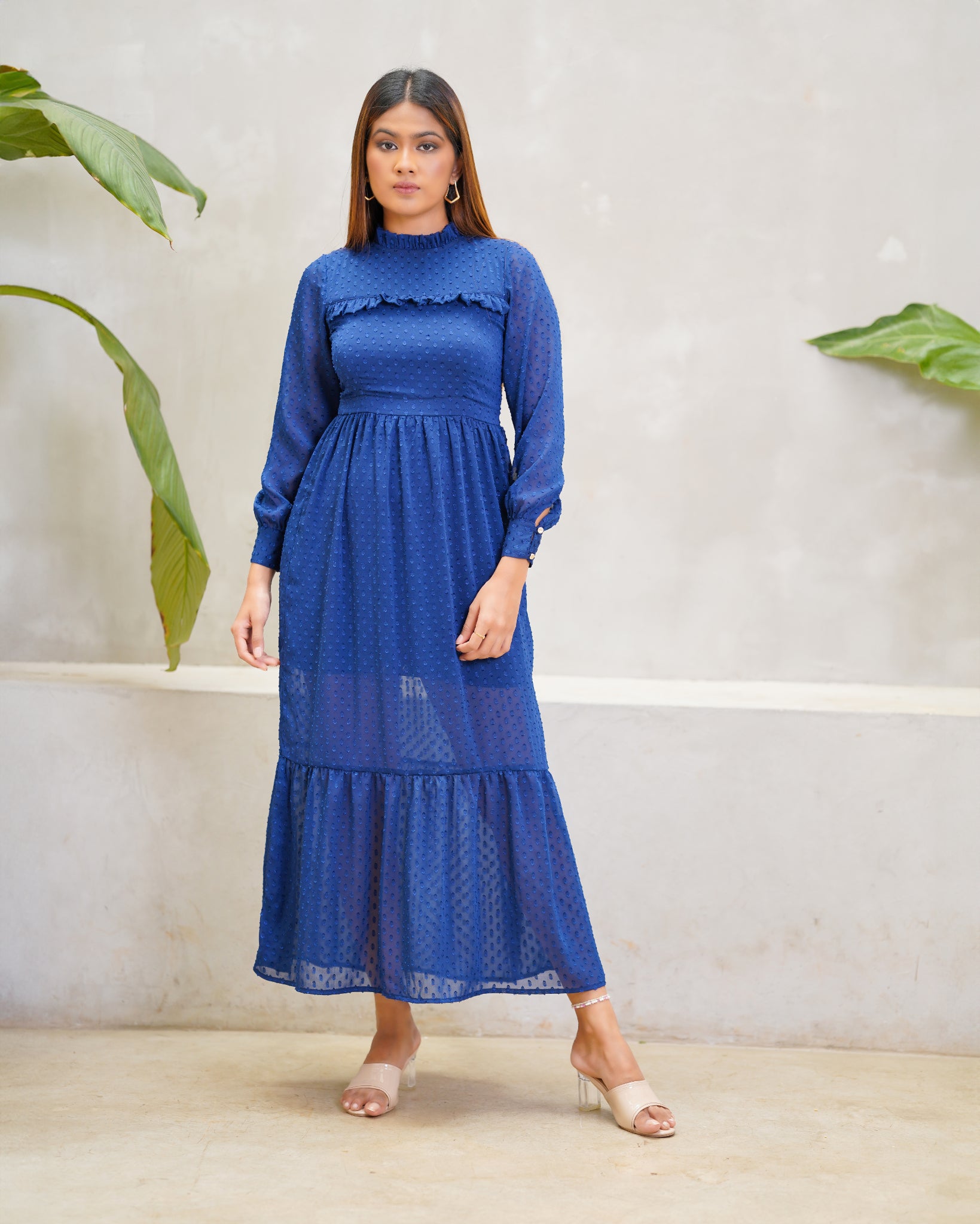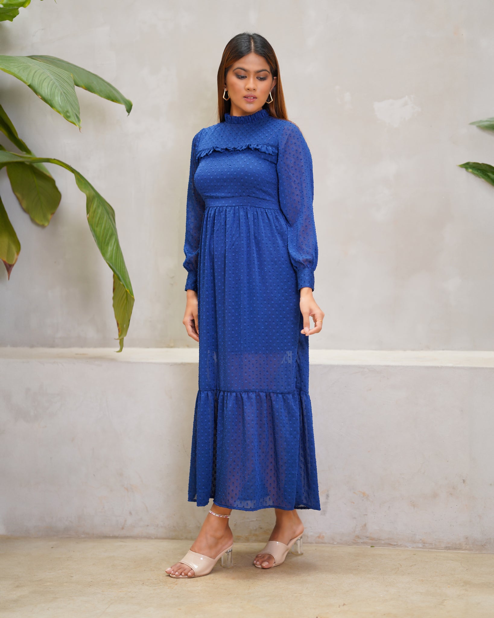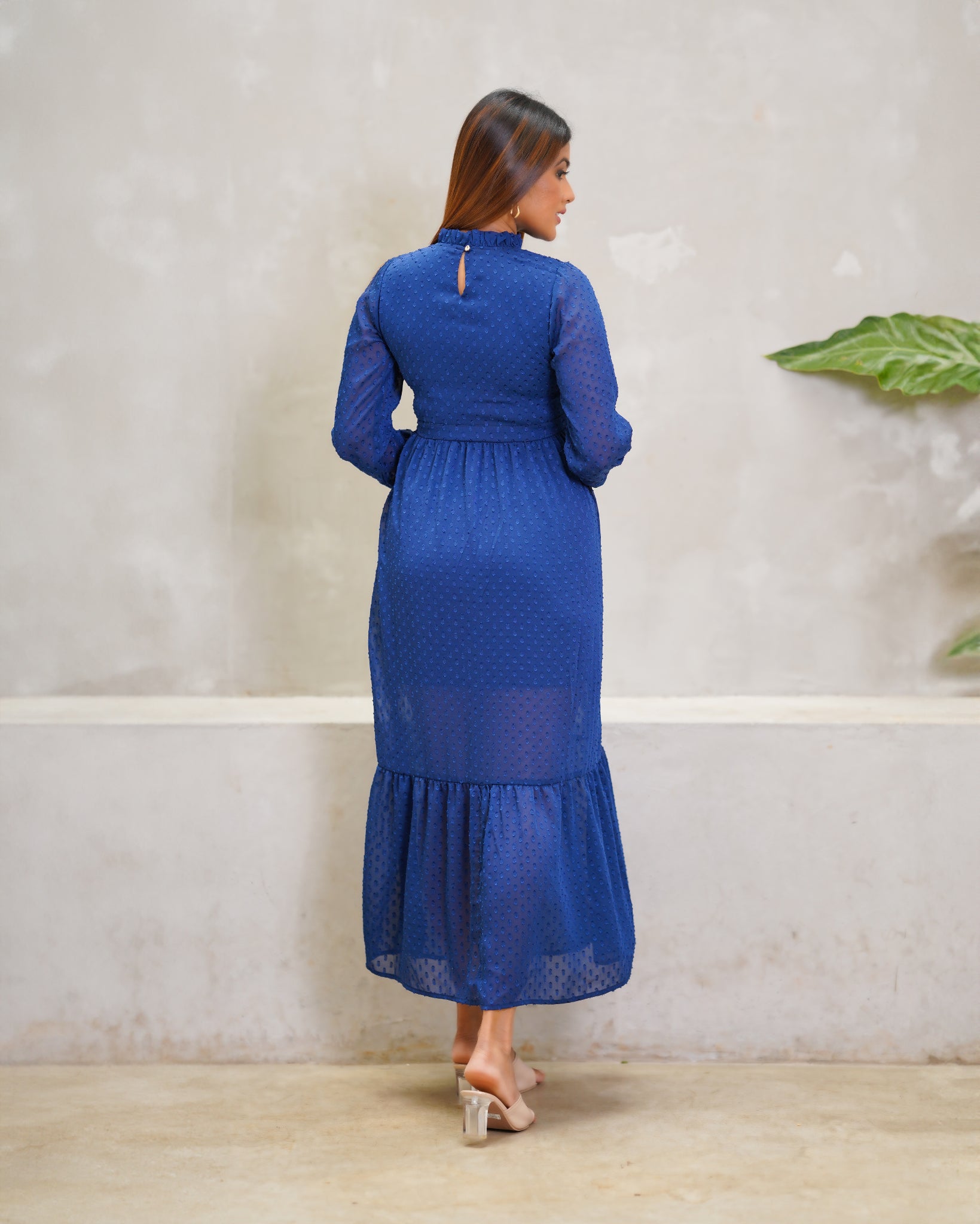 Crafted with elegant Swiss Dot fabric, this long sleeve maxi dress is perfect for any occasion. The dark blue color adds a touch of sophistication, while the classic design allows for endless styling options. Made with quality materials, this dress is both comfortable and stylish, making it a must-have addition to any wardrobe