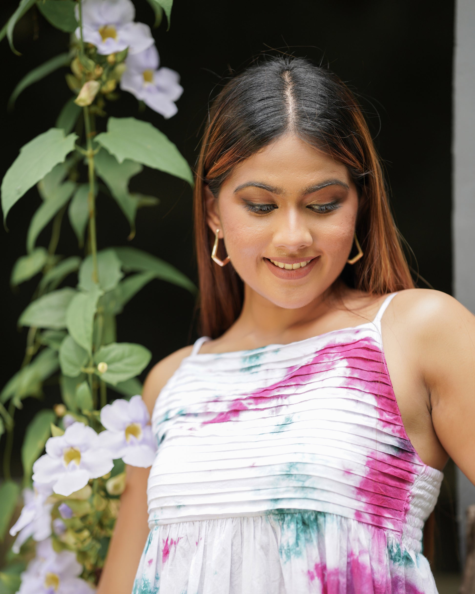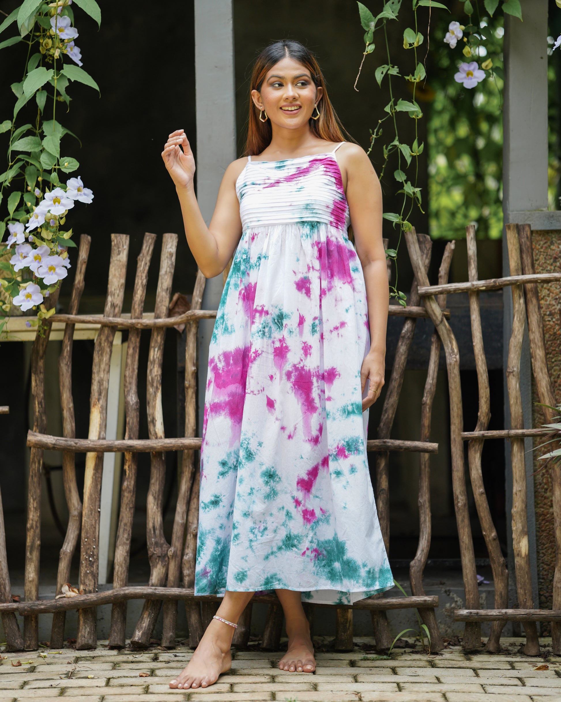 This Tie-Dye Strappy Pintuck Maxi Dress is perfect for summer outings. The vibrant tie-dye pattern adds a fun pop of color, while the strappy design and pintuck detailing provide a unique and stylish look. Made with high-quality materials, this dress offers both comfort and durability for all-day wear.