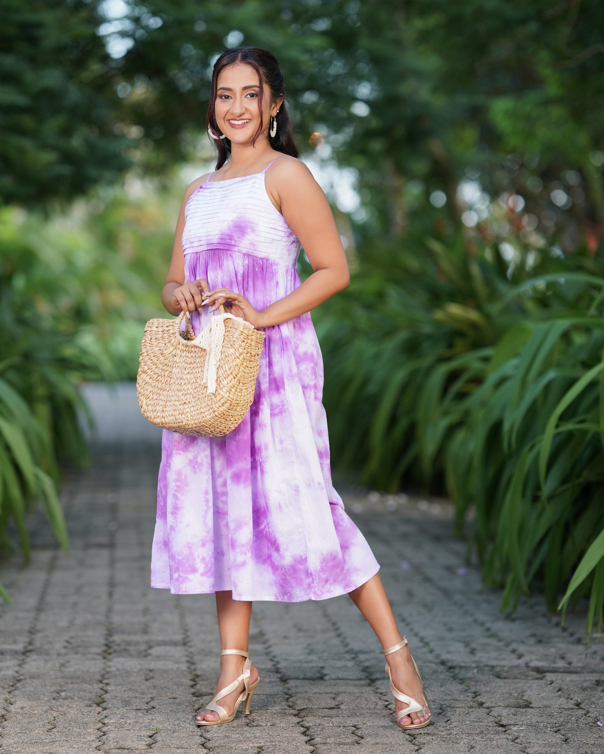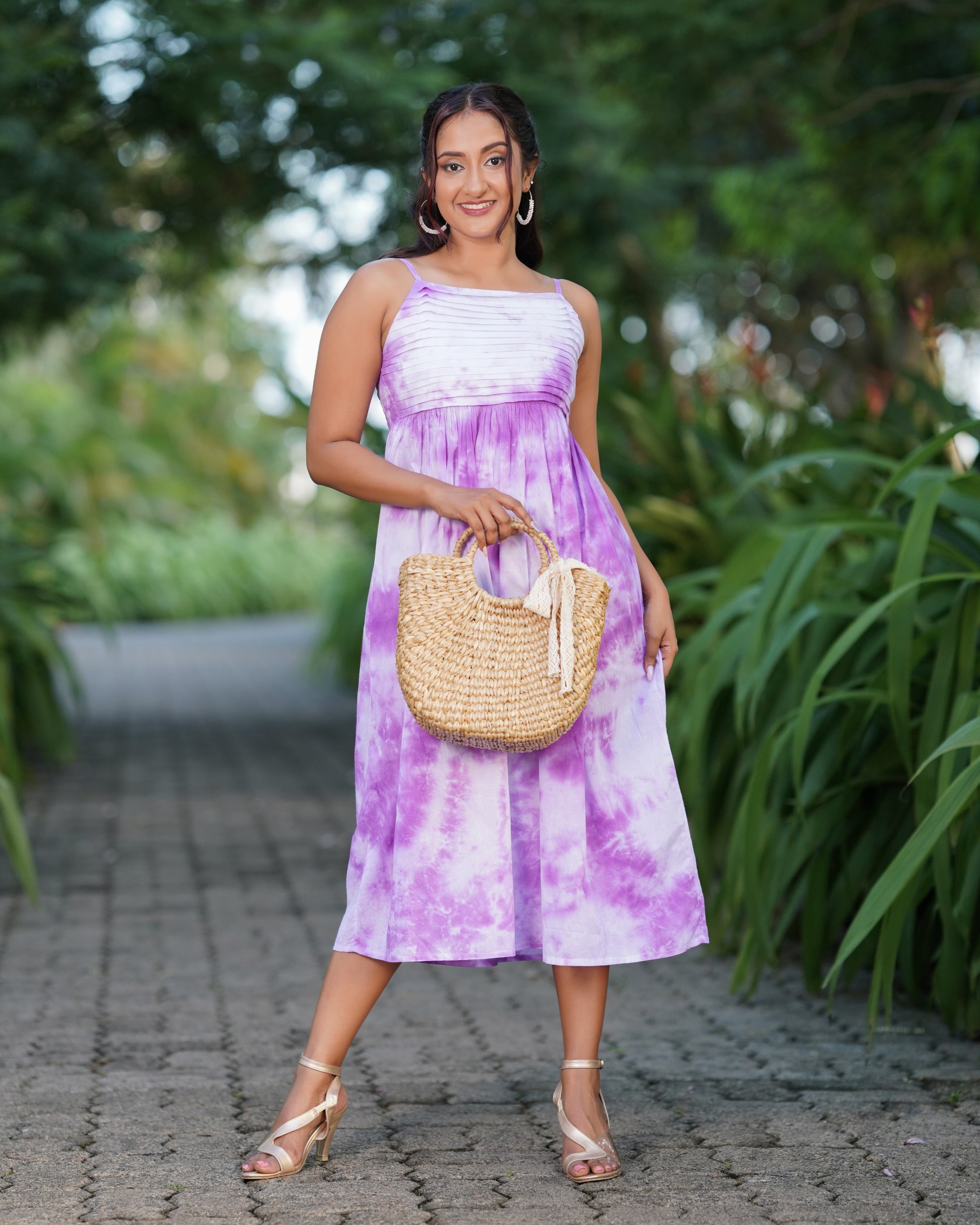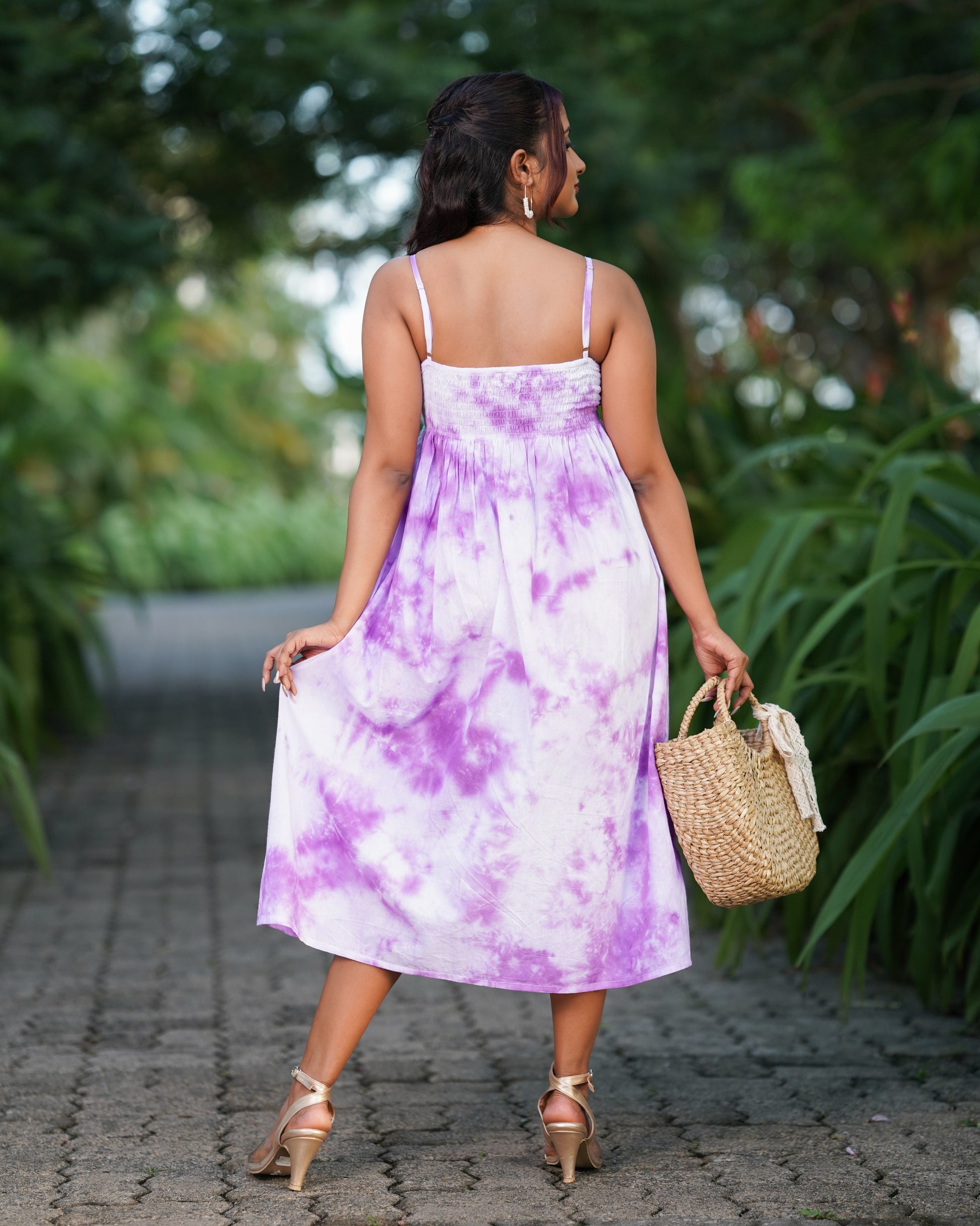 This maxi dress features a unique tie-dye design and pintuck detailing, making it a fashionable and chic choice for any occasion. The strappy back adds a touch of sexy, while the flowy silhouette provides comfort and ease of movement. Made with high-quality materials, it's both stylish and durable.